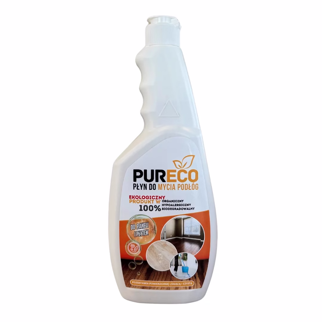 PURECO Płyn do Mycia Podłóg 750 ml – 100% ekologiczny, hypoalergiczny, organiczny i biodegradowalny środek czystości. Idealny do codziennego mycia wodoodpornych podłóg, skutecznie usuwa zanieczyszczenia, pozostawiając powierzchnie lśniące i czyste.